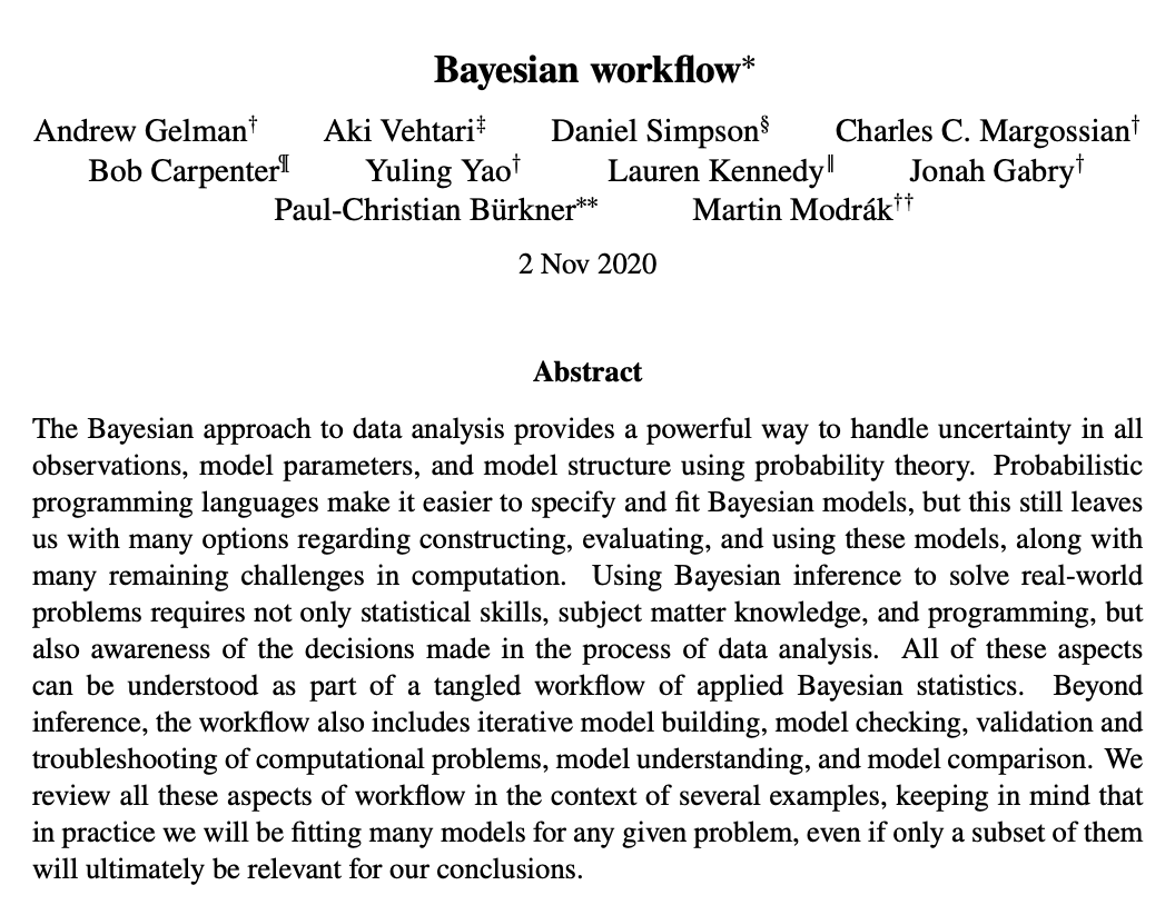 Gelman, A., Aki Vehtari, Daniel Simpson, Charles C. Margossian, Bob Carpenter, Yuling Yao, Lauren Kennedy, Jonah Gabry, Paul-Christian Bürkner, and Martin Modrák (2020). “Bayesian Workflow”. arXiv, https://arxiv.org/abs/2011.01808.